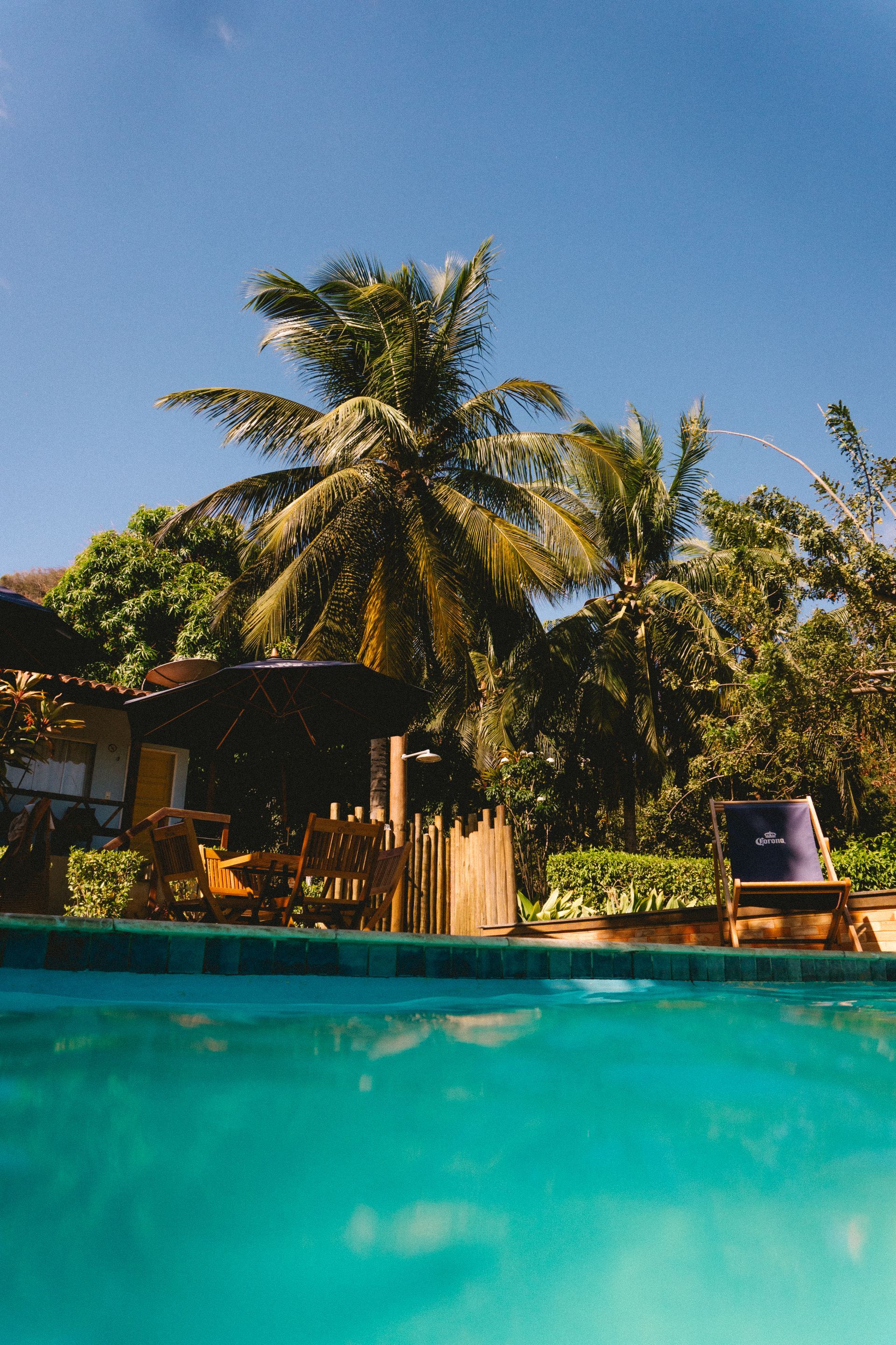 Piscina para relaxar após um dia de praia. A pousada dispõe de Wi-fi gratuito na recepção e lounge frontal, piscina ao ar livre e extensa área verde de onde é colhido parte de nosso café da manhã.